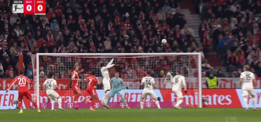 第45+2分鐘,伯溫開出任意球,波圖爾斯基頭球破門,美因茨1-1拜仁