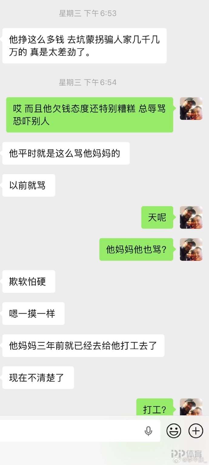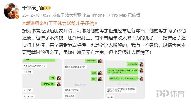 李平康曬出了多張聊天截圖表示:據(jù)戴琳曾經(jīng)身邊朋友介紹,戴琳對(duì)他的母親也是經(jīng)常進(jìn)行辱罵,他的母親為了幫他還債,也借了不少錢,還外出打工。有個(gè)曾經(jīng)年收入數(shù)百萬(wàn)的兒子,一把年紀(jì)了還要打工還債,甚至遭受辱罵虐待,也是挺讓人唏噓的。我有一個(gè)建議,懇請(qǐng)大家不要罵戴琳的母親了,雖然有教子無(wú)方之責(zé),但也是很讓人同情了!