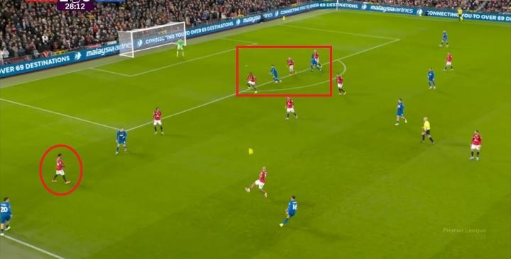 隨后曼聯(lián)在遠(yuǎn)端被伯恩茅斯繞出來,你就可以再次發(fā)現(xiàn)這個(gè)424有多么的空曠了: